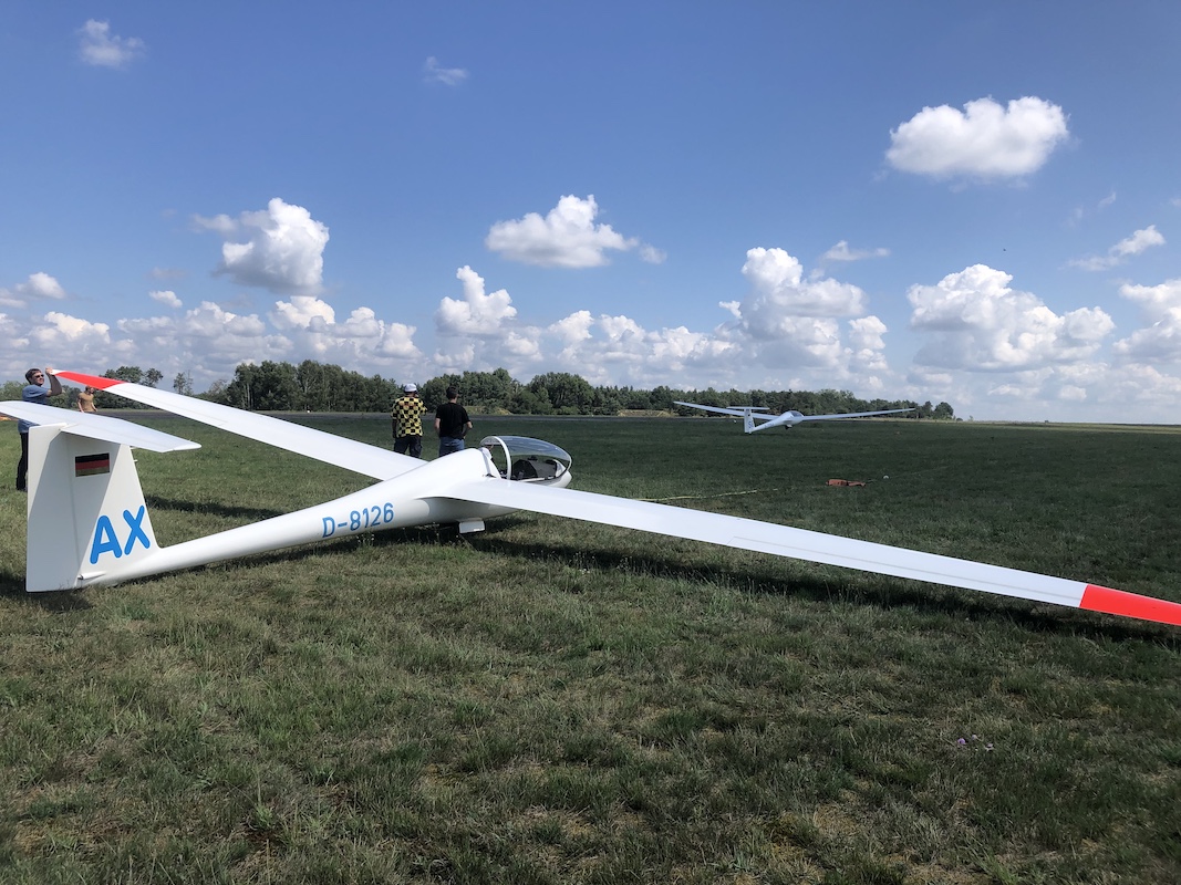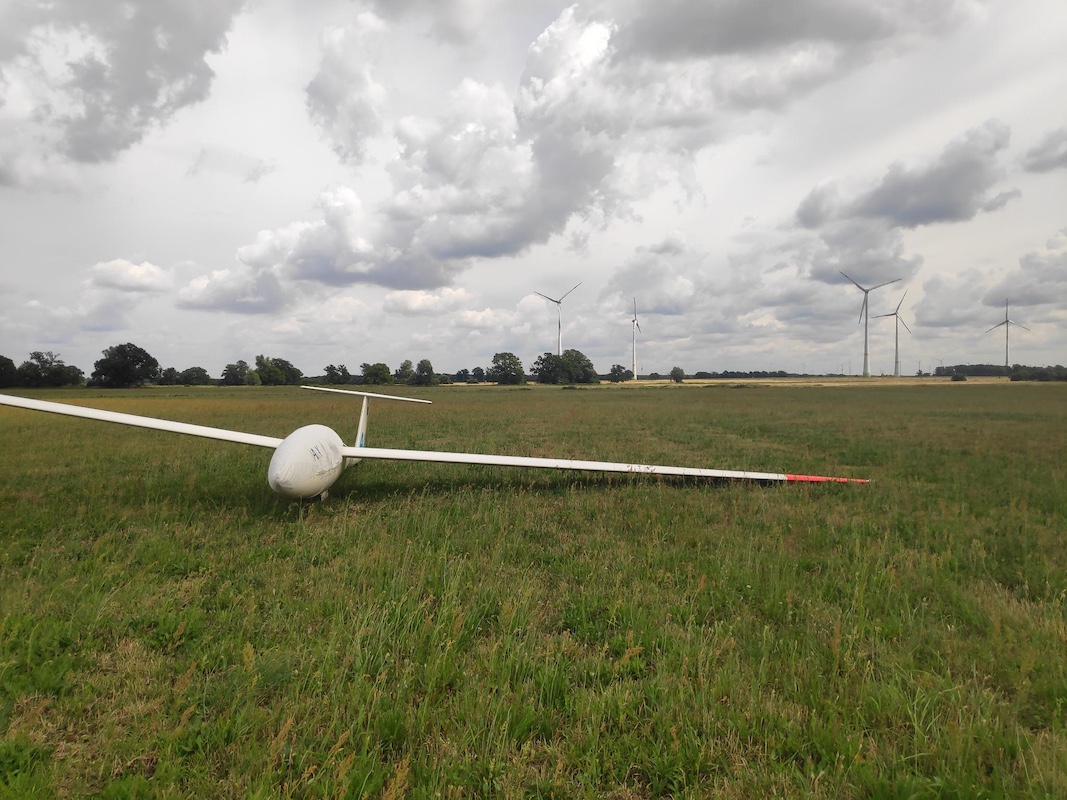 Angereist bin ich schon einen Tag früher, um das gute Wetter vor Wettbewerbsbeginn noch nutzen zu können. Am Trainingstag konnte ich dann gleich einen Schenkel nach Süden, in Richtung Magdeburg, fliegen. Auf dem Rückweg machte mir allerdings der starke Gegenwind – 30 bis 40 km/h – zu schaffen, sodass ich wieder in Stendal landen musste. Die Startwinden machten dort gerade Mittagspause, ich übte mich in Geduld. Als ich schließlich die Aufgabe begann, war ich schon über eine Stunde hinter meinem ursprünglichen Zeitplan. Die aufziehende Abschirmung machte die Thermik schwächer, der Gegenwind tat den Rest: die erste Außenlandung folgte geschwind.